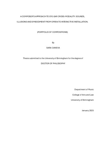 This practice-led PhD explores perception-related principles for composing. My research in Composition aims to establish artistic relations between listening and seeing, which I pursued by shaping and altering audiovisual expectations in varied settings and musical structures. Throughout the portfolio, I have refined my focus to increase the audiences’ and performers’ listening awareness through visual cues management or visual deprivation, finding how visual stimuli – or removal thereof – can enhance the auditory perception. Research questions revolve around articulating these points through multifarious musical outputs and media. In some pieces, cross-modal perception was a core interest that originated my compositional concepts and determined my approach to developing material. In others, eye-ear sensory illusions were practically incorporated into musical narratives by reducing or removing visual stimuli, such as with dark or visually empty performance spaces. Methods have involved mind mapping, field recordings, composing (in music notation software and DAW), artistic/scholarly collaborations and performance, which enriched the creative process. That has led to expanding the borders of contemporary music genres with cross-disciplinary approaches and public engagement. My background as a conductor also supported compositional perspectives on gesture-sound interconnectedness. All my compositions discussed in this commentary were commissioned and performed in international contexts throughout my PhD, which increased their significance and outreach.